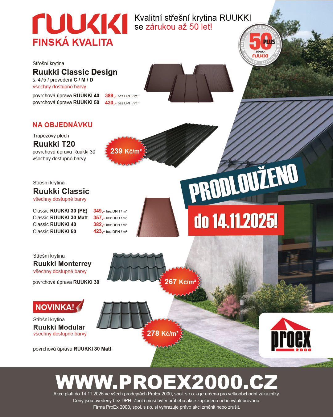 Z našeho akčního letáku prodlužujeme výhodné ceny na vybrané produkty Ruukki. Pokud máte zájem o kvalitní střešní řešení s dlouhou životností a skandinávskou precizností. Ruukki je ta správná volba.