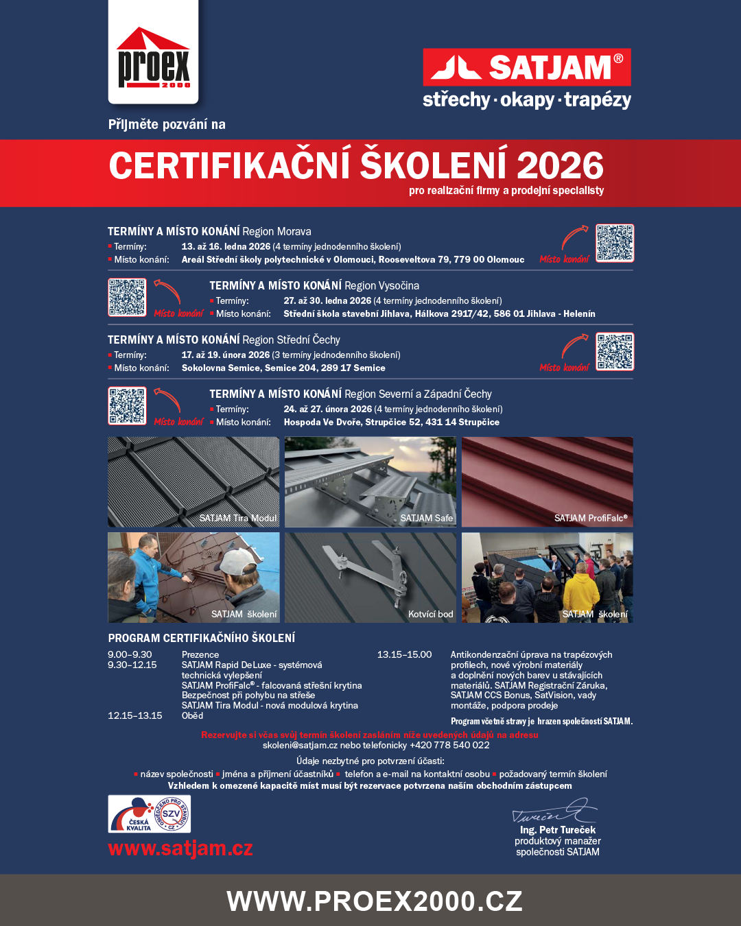 Rádi bychom vás pozvali na jednodenní certifikační školení SATJAM 2026, zaměřené na novinky, technické informace a aktualizace v sortimentu pro nadcházející sezónu. Program je určen montážním firmám, klempířům, pokrývačům i prodejním specialistům.