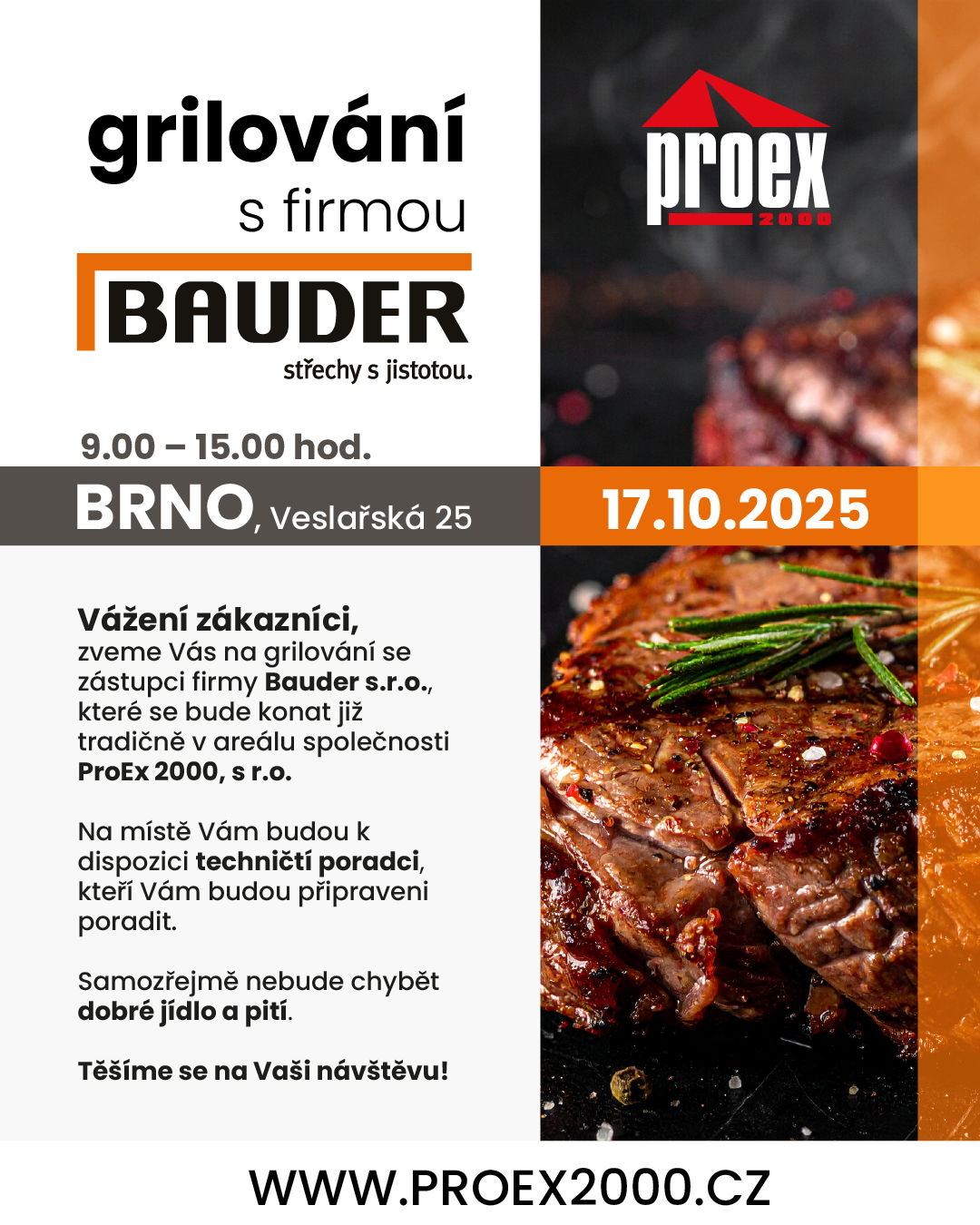 v pátek 17. října 2025 Vás srdečně zveme na grilování na naší pobočce v Brně, které proběhne od 9:00 hod. ve spolupráci s naším dodavatelem Bauder. Těšit se můžete na příjemnou atmosféru, dobré jídlo, přátelská setkání a samozřejmě i zajímavé novinky ze světa střech.