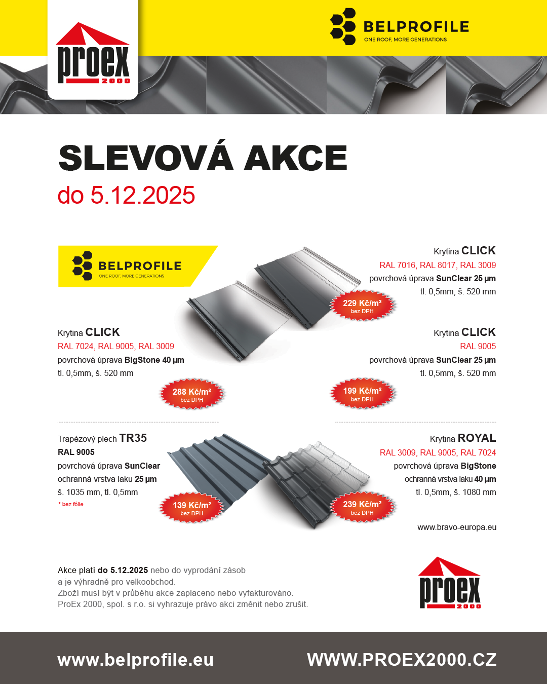 Belprofile je název dodavatele, jehož zboží pro vás máme nyní jako další ve slevě. Plechové střešní krytiny a trapézové plechy. Využijte výhodné ceny na vybrané položky ještě před koncem sezóny, jelikož akční nabídka platí až do 5. prosince! Nepropásněte příležitost nakoupit kvalitní materiál za lepší ceny.