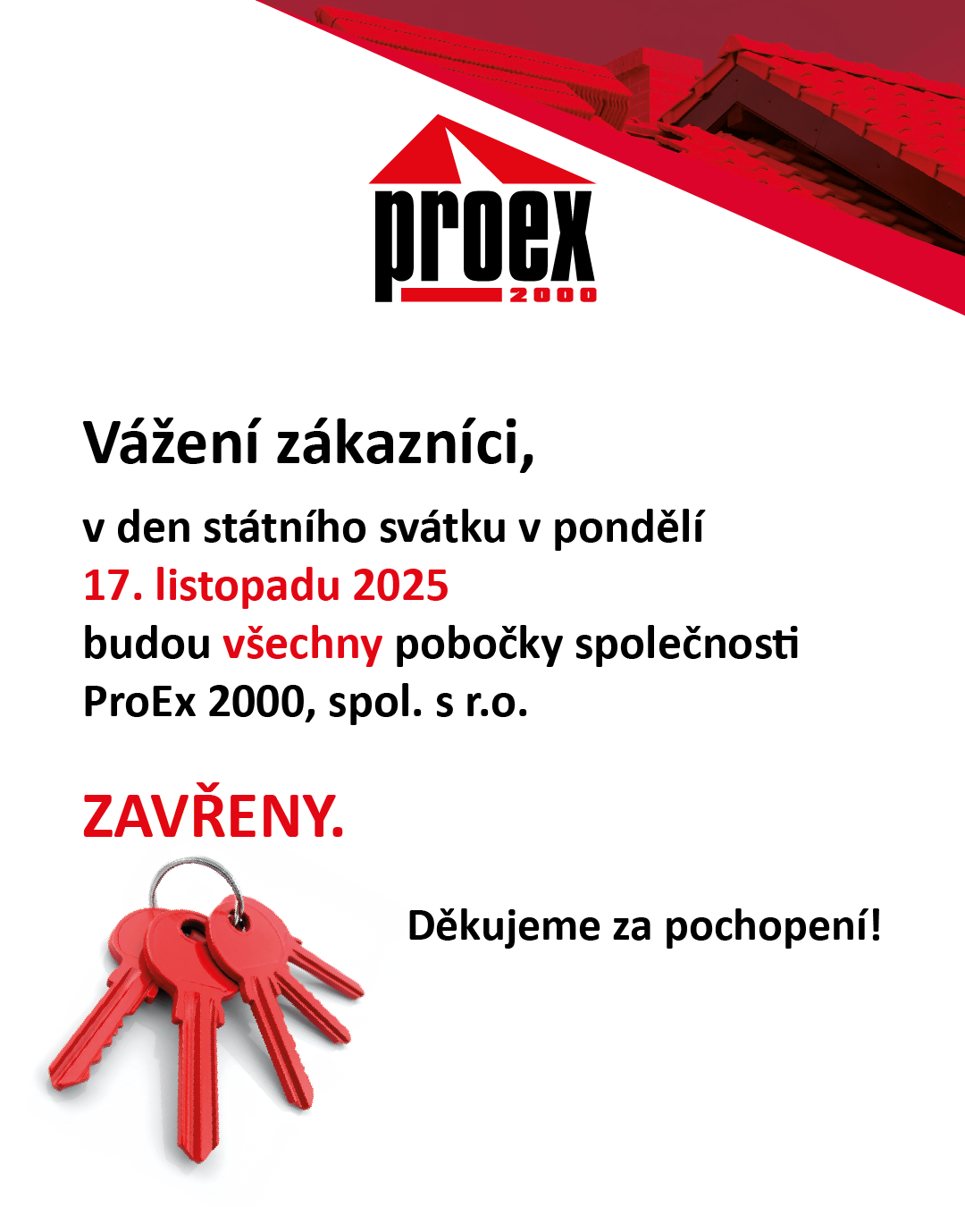 Vážení zákaznící, v pondělí 17. 11. 2025 budou všechny pobočky společnosti ProEx 2000, spol. s r.o. uzavřeny z důvodu státního svátku.