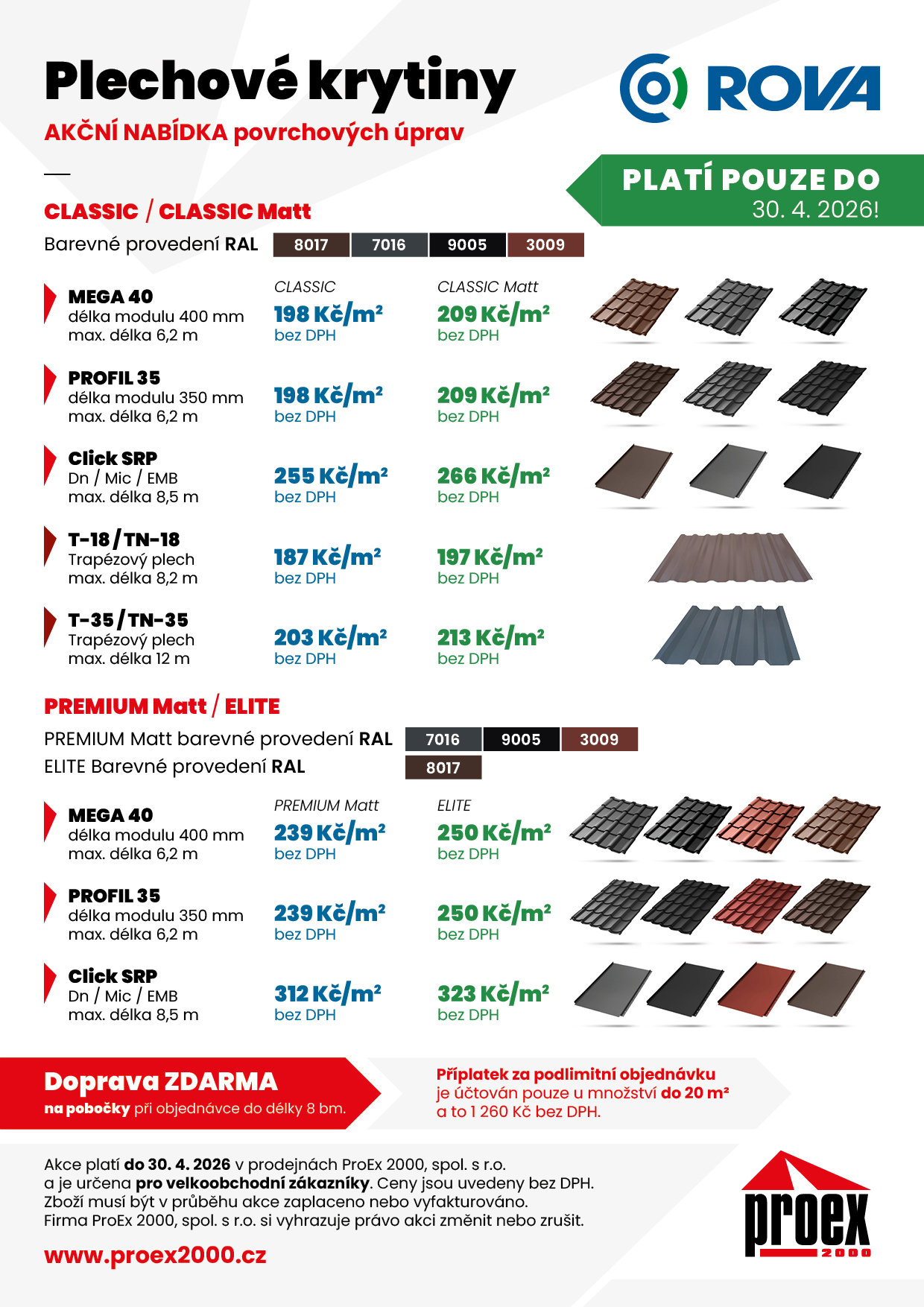 Akce je určena pro velkoobchodní zákazníky a vztahuje se na oblíbené střešní krytiny MEGA 40, PROFIL 35, Click SRP a trapézové plechy T-18 / TN-18, T-35 / TN-35.