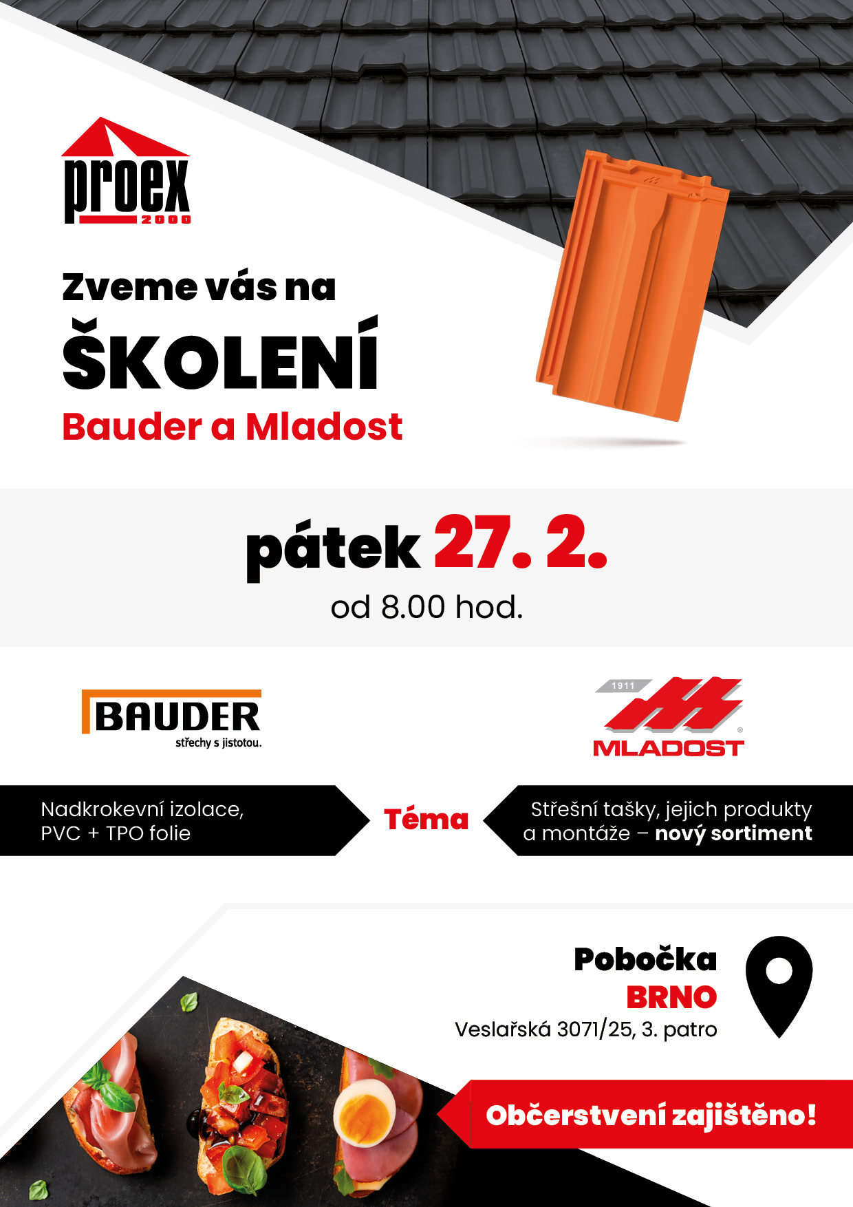 Zveme vás na odborné školení značek Bauder a Mladost, které se uskuteční v pátek 27. 2. od 8.00 hodin na naší pobočce Brno, Veslařská 3071/25, 3. patro.